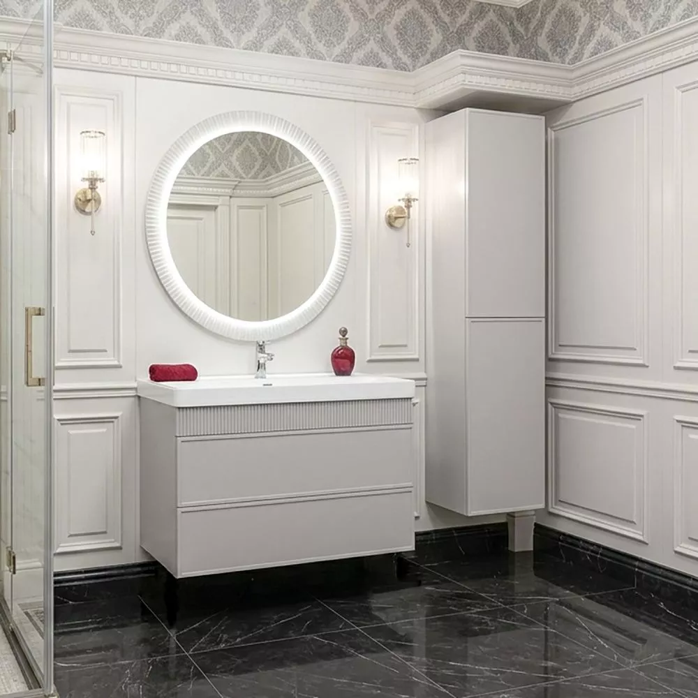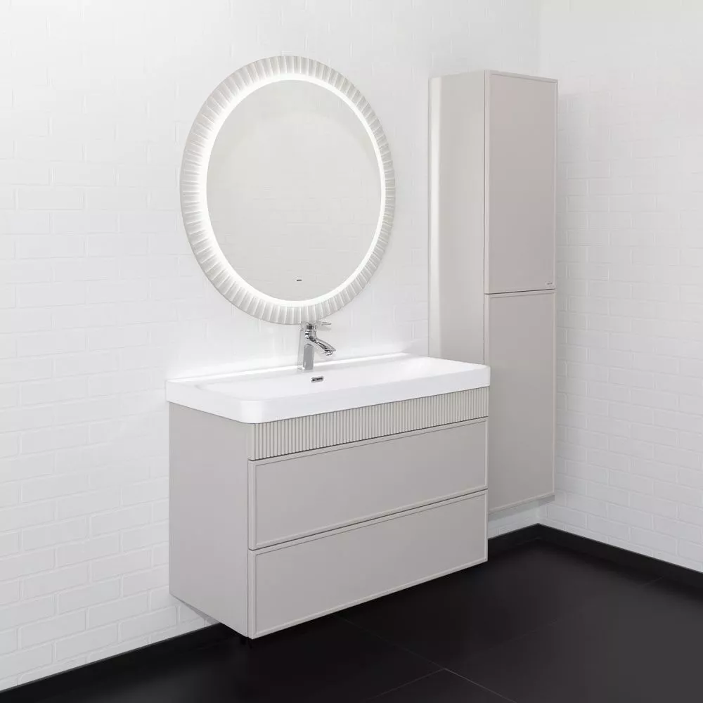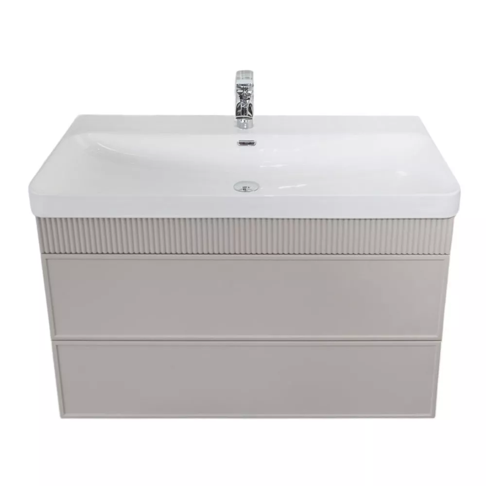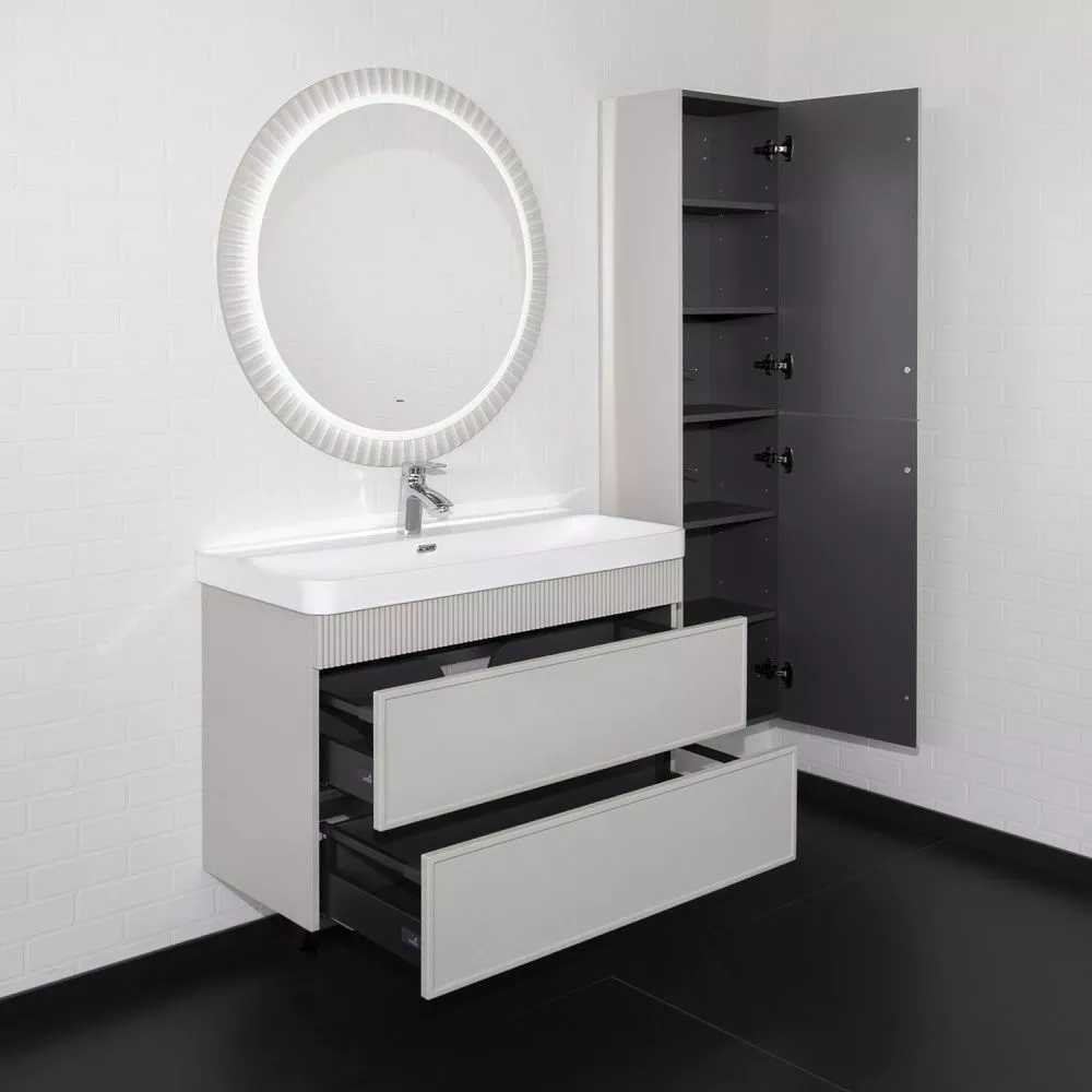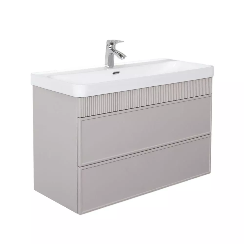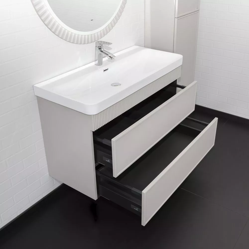 Подвесная тумба с двумя вместительными выдвижными ящиками (тандембоксы Hettich) оборудованными направляющими с системой плавного закрывания. Корпус тумбы изготовлены из влагостойкого ЛДСП. Фасады тумбы из МДФ фрезерованы кантом по периметру. Подпорная царга фрезерована вертикальным узором. Корпус и фасады тумбы затянуты в матовую пленку цвета "серый шёлк". Тумба подготовлена для подключения водоснабжения снизу и сзади.