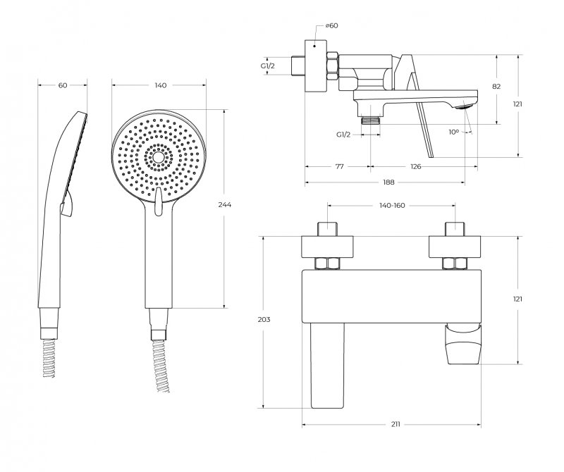 - Оснащение: душевая лейка / душевой шланг / держатель для душа